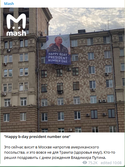 Кто-то решил сделать приятный сюрприз российскому президенту в честь его дня рождения и устроил необычную акцию напротив посольства США в Москве. На стене здания вывесили огромный баннер с поздравлением Путину.