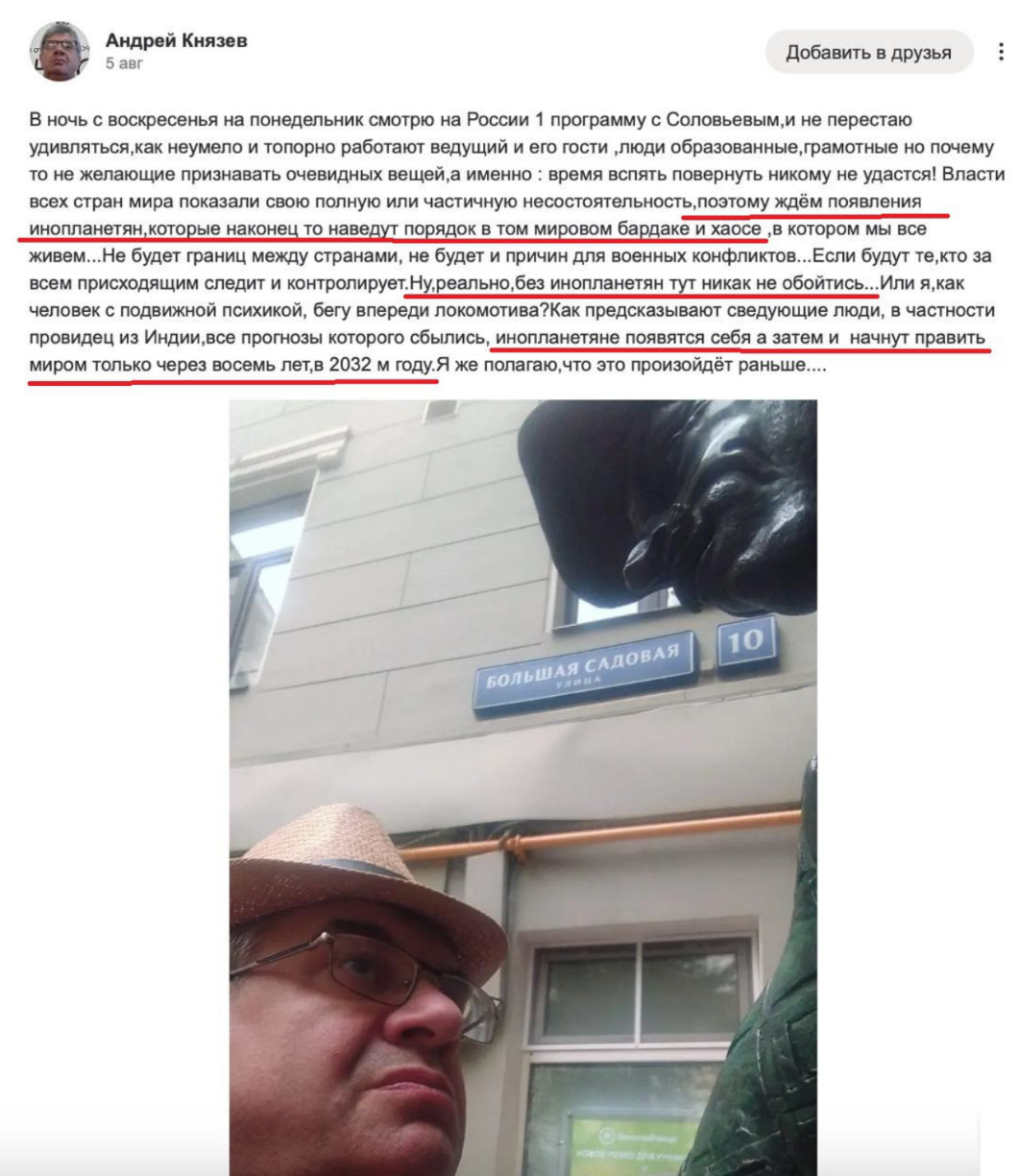 Узбекский журналист Князев, который спросил у Путина, что делать, когда Америку и Японию затопит, верит в инопланетян. Об этом он спокойно пишет в своих соцсетях. А ещё он оказался противников Соловьёва.