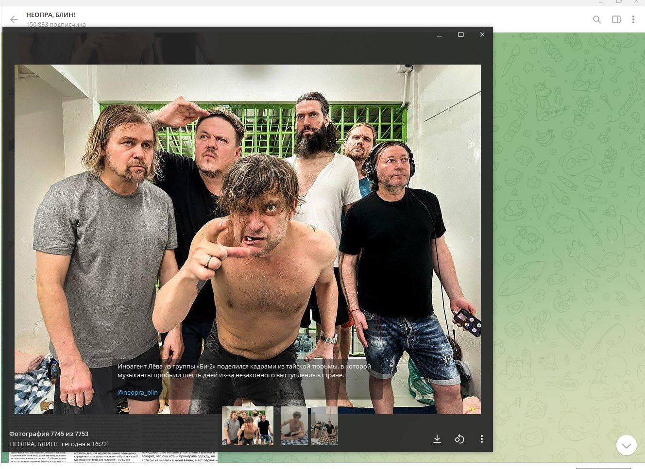 Шура, Лёва (Егор Бортник*) и остальная группа "Би-2" в Таиланде. Скриншот: телеграм-канал "Неопра, блин!"