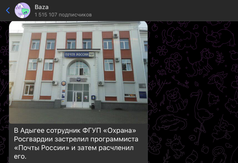 Сотрудник охраны выстрелом в голову из табельного оружия убил работника "Почты России" в республике Адыгея, затем расчленил его тело и выбросил в контейнер для мусора. По сообщению Telegram-канала Baza со ссылкой на собственный источник, причиной страшной расправы якобы стала давняя вражда между мужчинами.
