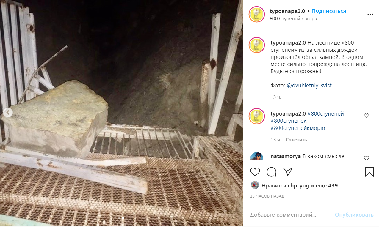 Дело в том, что прошедший ливень в Анапе не только подтопил дороги, но и вызвал камнепад, который задел спуск к морю.