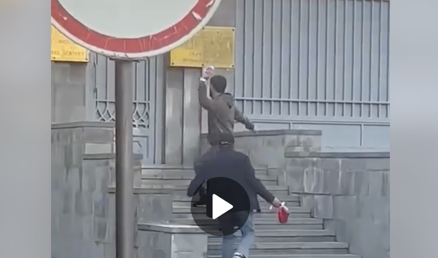 Полиция не смогла задержать злоумышленников, которые бросили пакеты с красной краской в посольство России. Видео активно распространяется в социальных сетях.