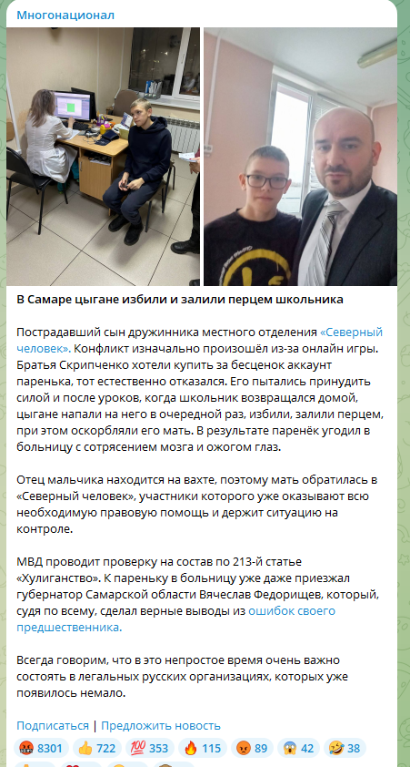 Сообщается, что пострадавший школьник - сын дружинника организации "Северный человек". Но мужчина уехал работать вахтовым методом, поэтому не смог вовремя вмешаться в конфликт сына с цыганами.