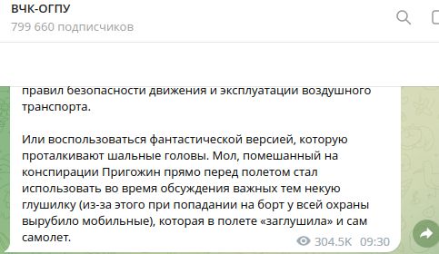 И тут в Сети появляется новая версия произошедшего. Фантастическая. Якобы Пригожин "прямо перед полётом стал использовать во время обсуждения важных тем некую глушилку (из-за этого при попадании на борт у всей охраны вырубило мобильные), которая в полёте "заглушила" и сам самолёт".