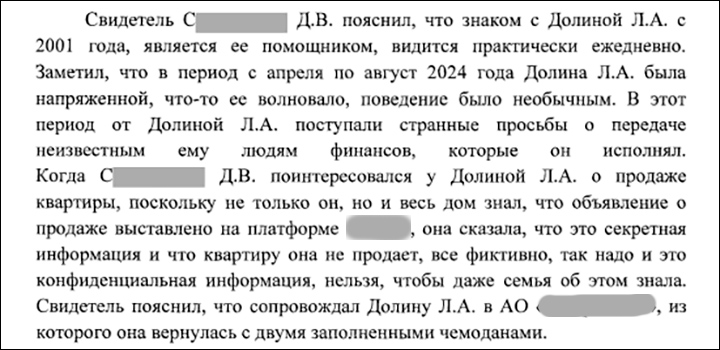 С апреля по август 2024 года он замечал необычное поведение своей начальницы. Она была обеспокоенной и напряжённой. Кроме того, Долина стала давать поручения, которых не было ранее, - передавать деньги незнакомым людям.