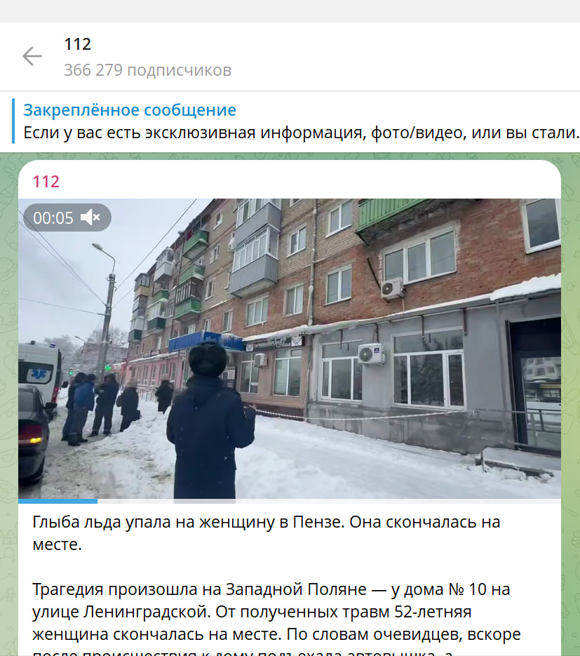 Трагедия произошла не только в Москве. Огромная сосулька убила ещё одну женщину, уже в Пензе. Тот же источник пишет, что от полученных травм 52-летняя женщина скончалась на месте. По словам очевидцев, вскоре после происшествия к дому подъехала автовышка, а территорию вдоль здания огородили. Сейчас прокуратура проводит проверку.