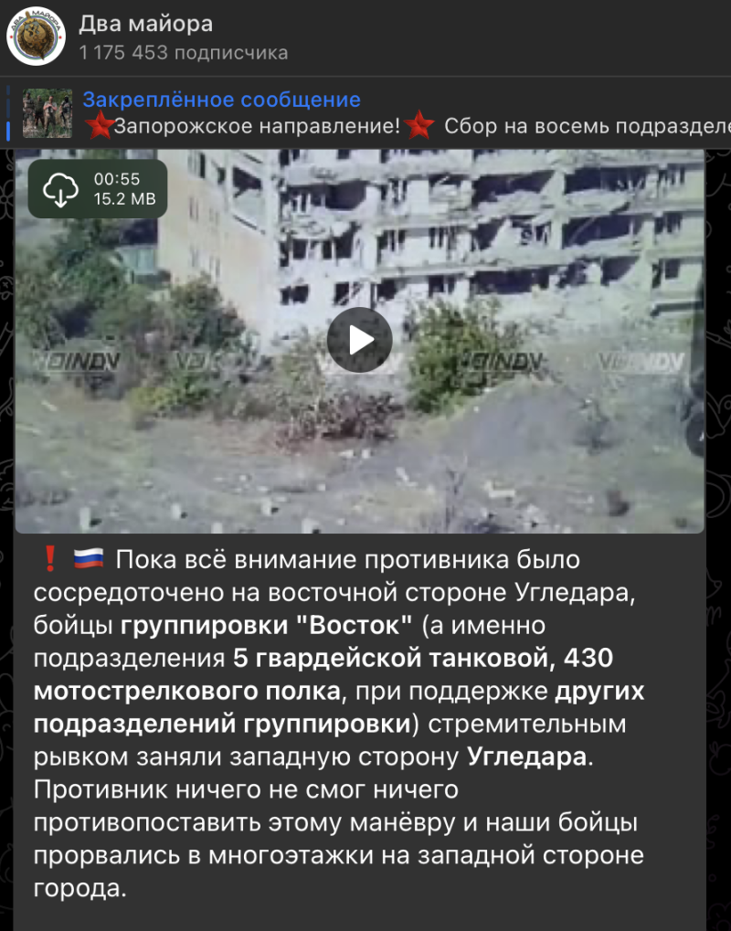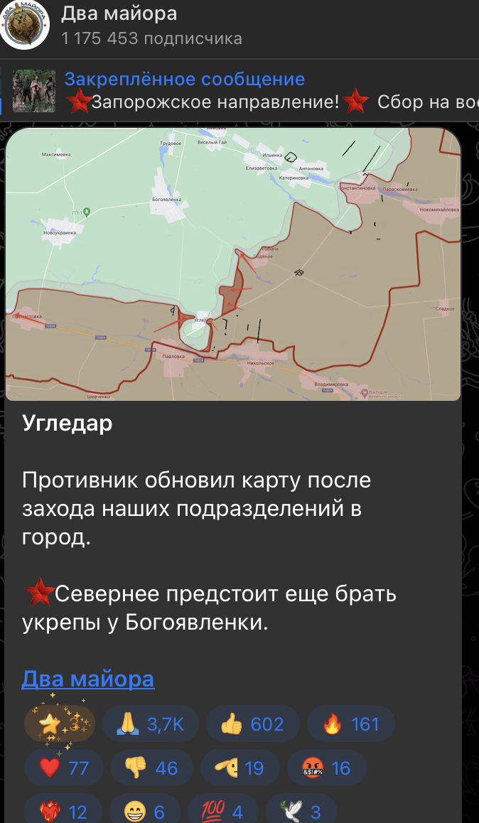 Бои продолжаются не только в Угледаре, но и на Покровском направлении, где русская армия активно наступает. На днях поступили сообщения о том, что войска смогли перерезать одну из дорог, ведущую из Цукурино в Горняк. Также отмечается, что наши силы вошли на территорию шахты имени "Святителя Василия Великого", продвинувшись на один километр от Украинска. Хотя продвижение даётся тяжело, оно всё же продолжается.
