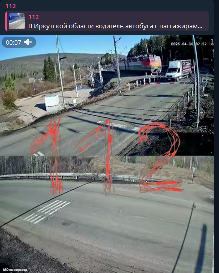 Этот переезд находится в Усть-Куте, и он имеет все основания иметь дурную славу: в 2023 году на этом месте состав снёс грузовик, погибли водитель автомобиля и два машиниста. В этом году в феврале - ещё один инцидент. Автобус с пассажирами выехал на рельсы - и заглох. Пассажиры в панике выбегали из салона, спасаясь от приблежающегося состава.