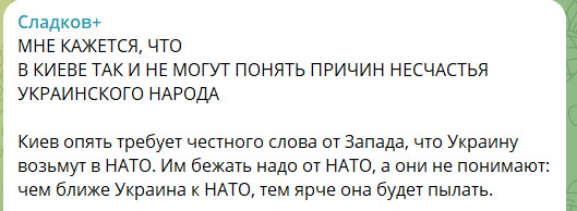 Им бежать надо от НАТО, а они не понимают: чем ближе Украина к НАТО, тем ярче она будет пылать. Ну не мы выдумали этот жестокий мир, он таков есть. Как только сосед всерьёз говорит соседу: я хочу стать твоим смертельным врагом - его приходится обнулять. Украинцы не понимают: