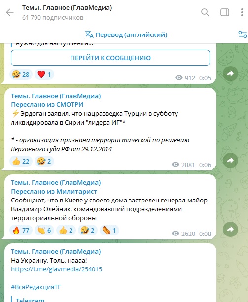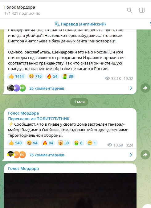 "В Киеве убит несуществующий генерал, командующий силами теробороны […] Похоже, что прислали в обратную связь на каналы, которые вообще не проверяют информацию, и фейк летит по Сети. Силами теробороны командует генерал Игорь Танцюра, что за генерал Владимир Олейник - никто не знает".