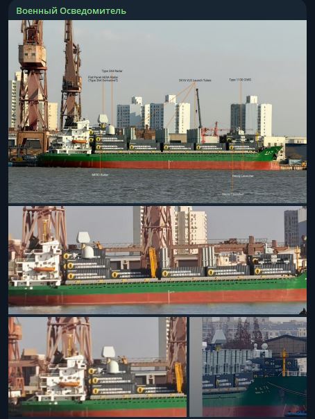 Контейнеровоз с замаскированными под гражданские контейнеры вертикальными пусковыми установками ракет, РЛС и ЗРК был замечен в Китае, обращает внимание телеграм-канал Военный осведомитель.