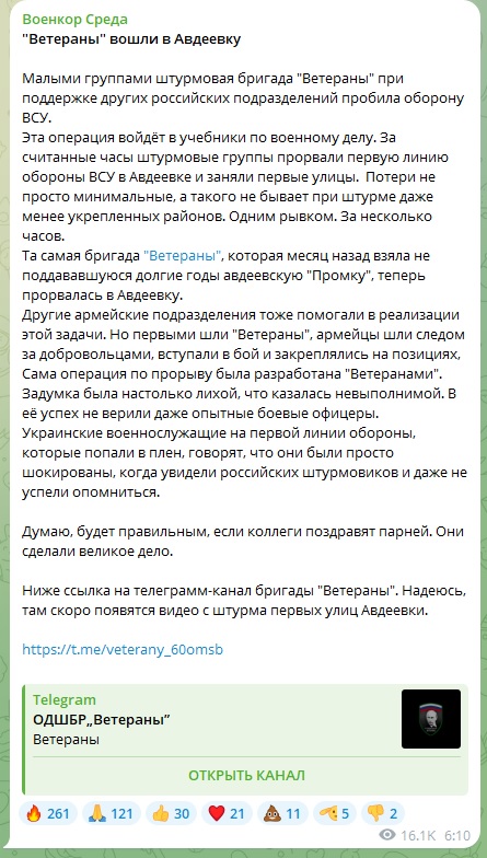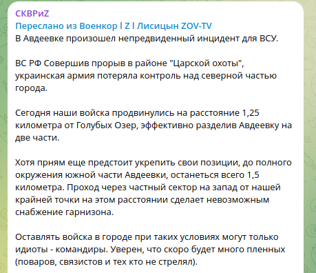 Армия небратьев потеряла частичный контроль над Авдеевкой. Военкоры рассказывают о "непредвиденном инциденте" после прорыва наших войск в районе бывшей базы отдыха "Царская охота", после которого скоро будет много пленных. Говорится и о "клешнях", между которыми оказался зажат противник.