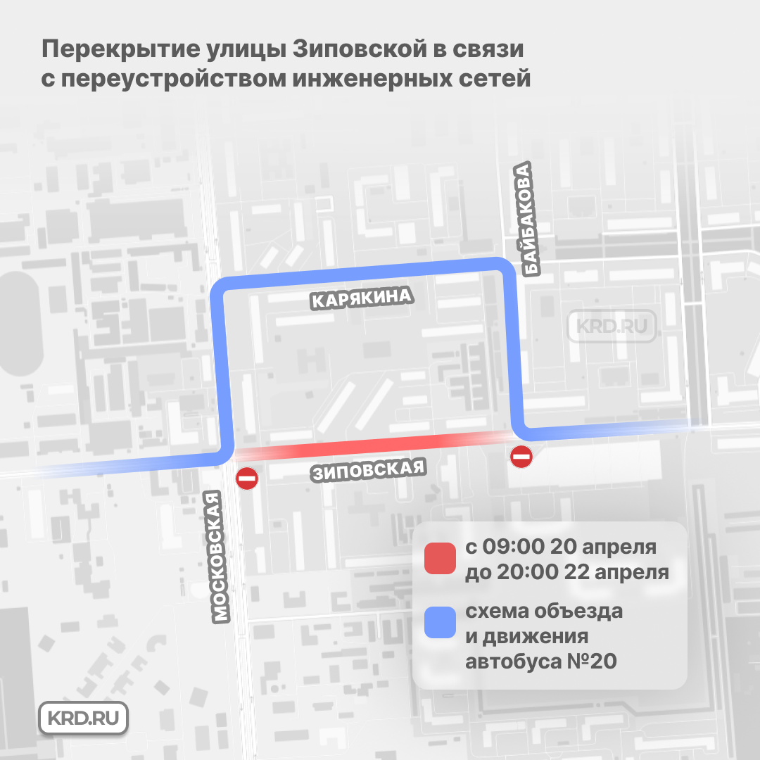 Это касается как водителей личного транспорта, так и общественного. Автобус на маршруте №20 будет перевозить пассажиров по объездному пути – по Байбакова, Карякина и по Московской обратно на Зиповскую, таким же манером, он будет возвращаться.