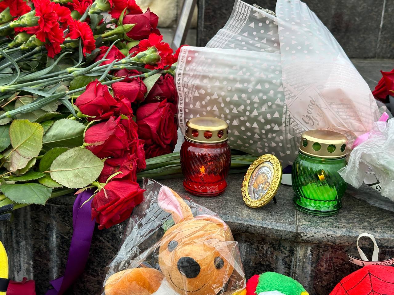 Горожане несут цветы и мягкие игрушки храму Святого Александра Невского.