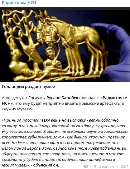 Ранее сообщалось, что суд Амстердама постановил вернуть "украинскому народу" коллекцию скифского золота, которая была передана крымскими музеями для выставки в Нидерландах. Президент Украины Владимир Зеленский уже заявил, что сначала Киев "вернёт" скифское золото, а потом и весь Крым.