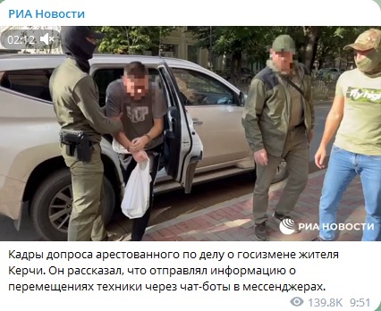 Позже на связь с ним вышли представители украинской разведки, и житель Керчи передавал им данные уже адресно. Информацию предоставлял как в виде фотографий, так и текстовыми сообщениями. Теперь против него возбуждено уголовное дело по статье "Госизмена в форме шпионажа".