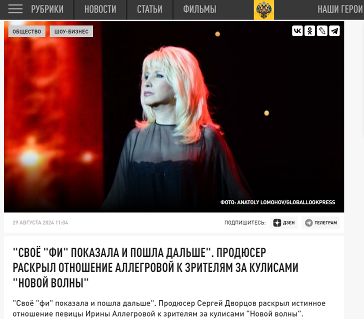 "Своё "фи" показала и пошла дальше". Продюсер раскрыл отношение Аллегровой к зрителям за кулисами "Новой волны". Фото: Царьград