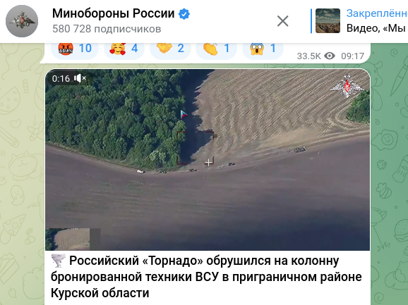 В приграничном районе Курской области разбита ещё одна колонна. На этот раз - вражеская. В Минобороны России подтвердили факт уничтожения колонны бронированной техники ВСУ. Уточняется, что на противника обрушили мощь РСЗО "Торнадо-С".