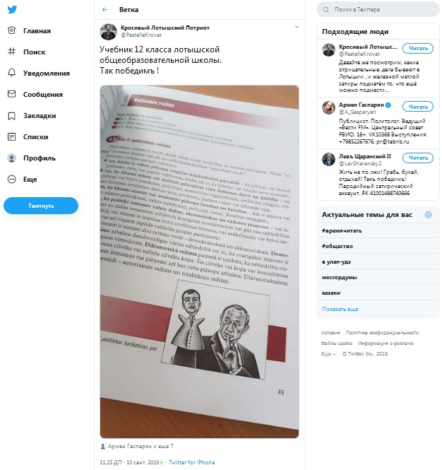 В официальном учебнике для 12-го класса латышской общеобразовательной школы имеется карикатура на президента России Владимира Путина и премьер-министра Дмитрия Медведева. Соответствующее фото было опубликовано в Twitter.