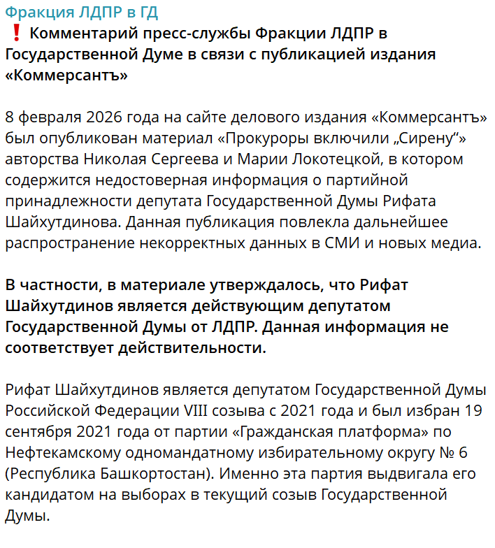 Представители ЛДПР заявили, что подозреваемый в коррупции депутат Госдумы Рифат Шайхутдинов не имеет к их партии никакого отношения. В официальном заявлении, опубликованном в Telegram-канале думской фракции ЛДПР, говорится, что политик был избран депутатом VIII созыва от партии "Гражданская платформа".