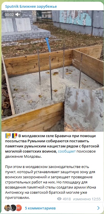 И это несмотря на то, что по молдавским законам воинские захоронения считаются охранной зоной - строительные работы там запрещены. Но появившийся в канале видеролик свидетельствует - площадку для стелы уже подготовили.