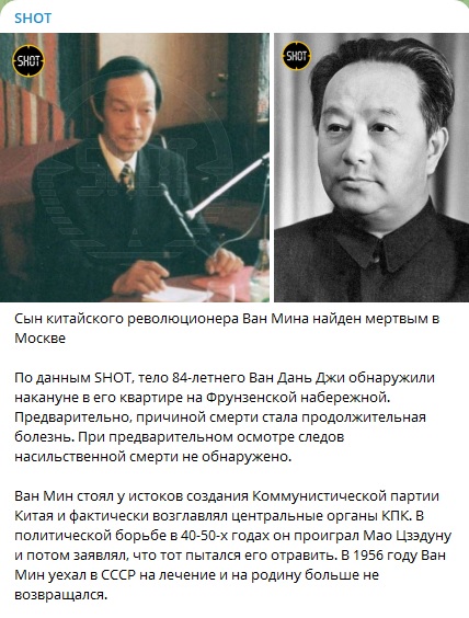 В Москве умер сын китайского революционера Ван Мина, соратника Мао Цзэдуна. Ещё в 50-х годах прошлого века Ван Мин с семьёй перебрался в Россию.