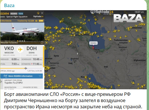 Тогда также возникала ситуация, когда единственным самолётом в воздушном пространстве Ирана после закрытия неба из-за иранской атаки на Израиль оказалось русское судно - это был борт Ту-214 специального лётного отряда "Россия". Отмечалось, что на борту правительственного самолёта находится русская делегация с вице-премьером России Дмитрием Чернышенко. Делегация летела в катарскую Доху для участия в третьем саммите Диалога по сотрудничеству в Азии, который проходит 2 и 3 октября.