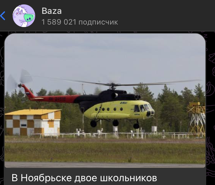 В Ноябрьске двое школьников подожгли вертолёт, надеясь, что за это получат 5 миллионов рублей. По информации телеграм-канала Baza, всё произошло в ночь на 11 сентября.