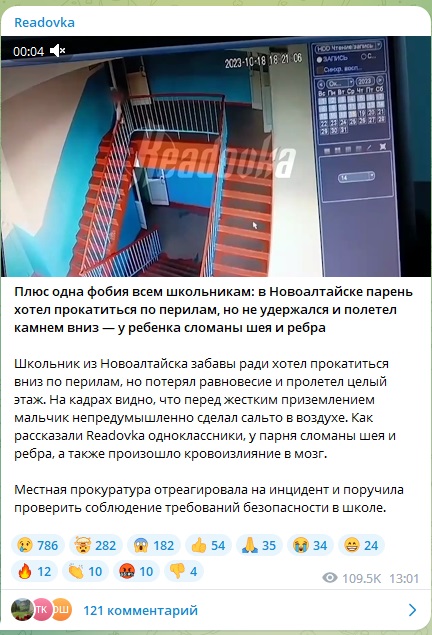 Приземление было весьма жёстким: с высоты нескольких метров ученик рухнул на бетонный пол. Как сообщает телеграм-канал Readovka, у школьника сломаны рёбра и шея, произошло внутричерепное кровоизлияние. Он госпитализирован.