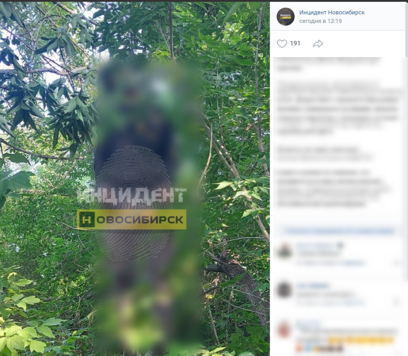 По информации телеграм-канала "Инцидент Новосибирск", сначала ребёнок увидел в кустах пакет с вещами, а затем и висевшее на дереве тело. Испуганный мальчик позвал родителей, а те, в свою очередь, вызвали на место происшествия скорую помощь и полицию.