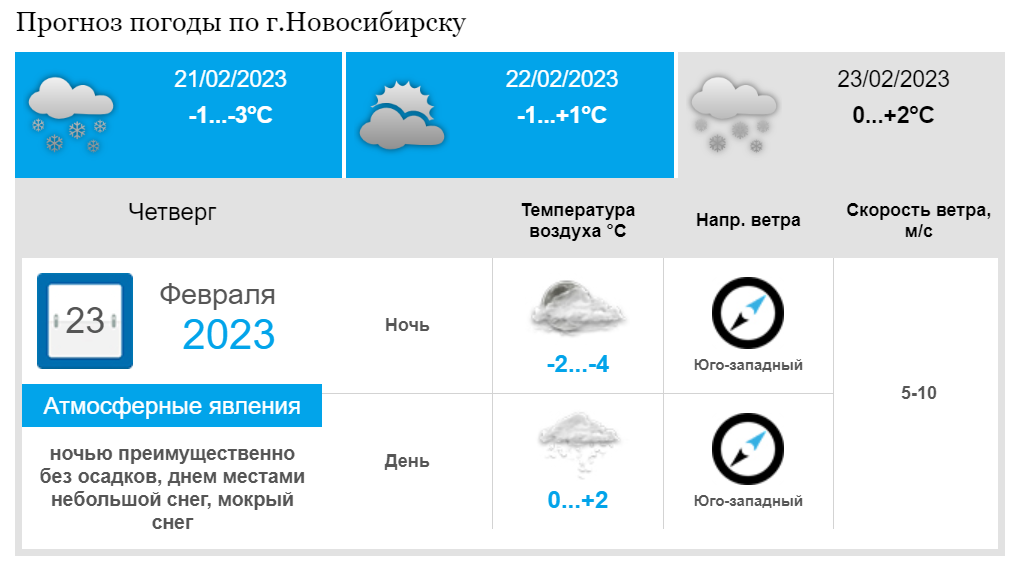 На последней неделе февраля синоптики прогнозируют плюсовые температуры в Новосибирске. По данным Западно-Сибирского гидрометцентра, завтра, 21 февраля ещё будут сохраняться минусовые температуры. Ночью — минус 9-11 градусов, в пригороде до минус 14 градусов. Днём — минус 1-3 градуса. Ожидается переменная облачность, ночью преимущественно без осадков, днем небольшой снег, мокрый снег. На дорогах местами гололедица. Ветер юго-западный 3-8 м/с.