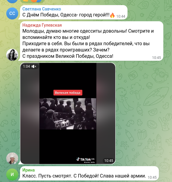 "Молодцы, думаю, многие одесситы довольны! Смотрите и вспоминайте, кто вы и откуда! Приходите в себя. Вы были в рядах победителей, что вы делаете в рядах проигравших? Зачем? С праздником Великой Победы, Одесса!" - отреагировала Надежда Гулевская.