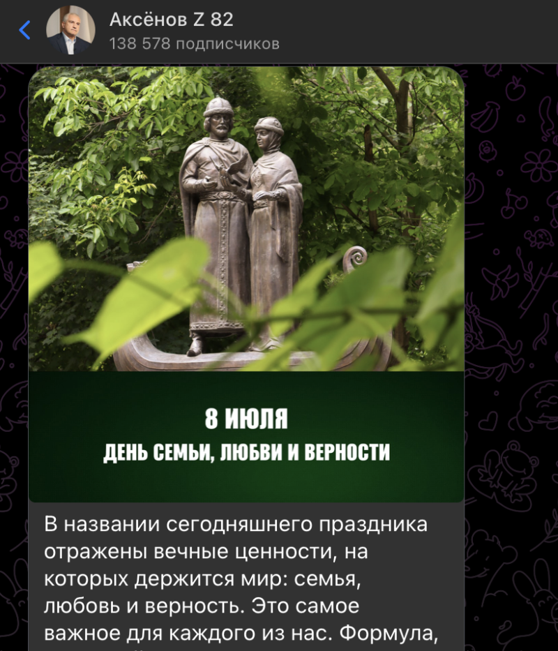 Глава Республики Крым Сергей Аксёнов в особый день напомнил всем русским о главных ценностях, на которых держится мир. В своём телеграм-канале политик написал, что в названии праздника, который мы отмечаем 8 июля, отражено главное: семья, любовь и верность.