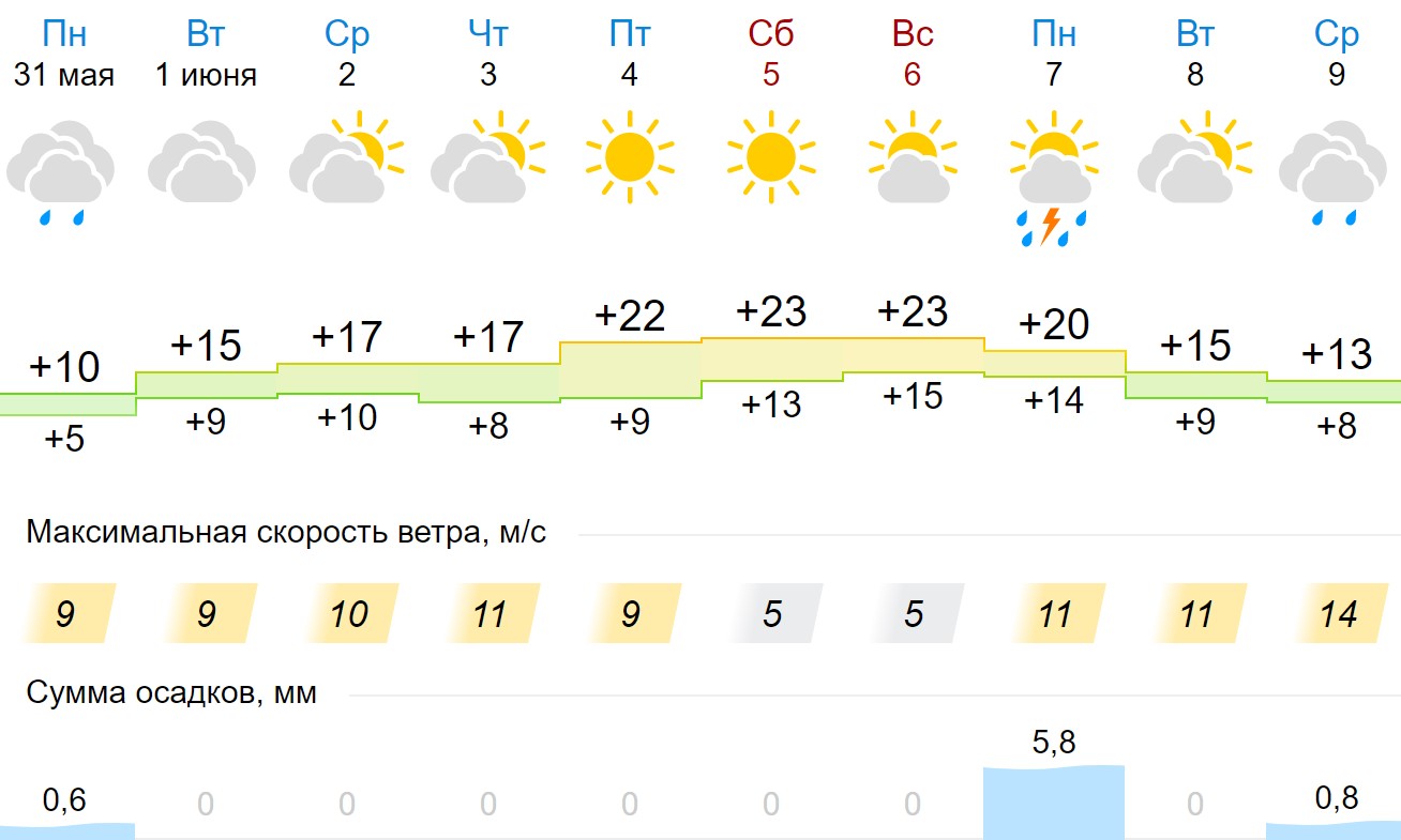 Сегодня, 31 мая, ожидается небольшой дождь, столбик термометра поднимется до отметки +10 градусов.