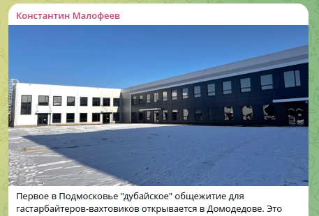 Учредитель Царьграда Константин Малофеев рассказал в своём Telegram-канале о первом в Подмосковье "дубайском" общежитии для гастарбайтеров-вахтовиков. Оно открывается в Домодедове.