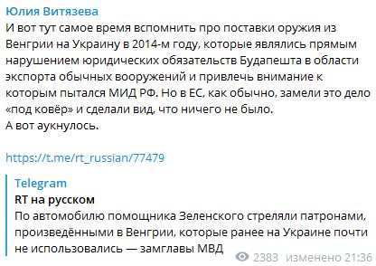 Журналистка Юлия Витязева сразу же напомнила, что Венгрия поставляла оружие на Украину в 2014 году, нарушая взятые на себя обязательства по отказу от экспорта вооружения. МИД России пытался привлечь внимание международной общественности к этому, но Москву никто не слушал.