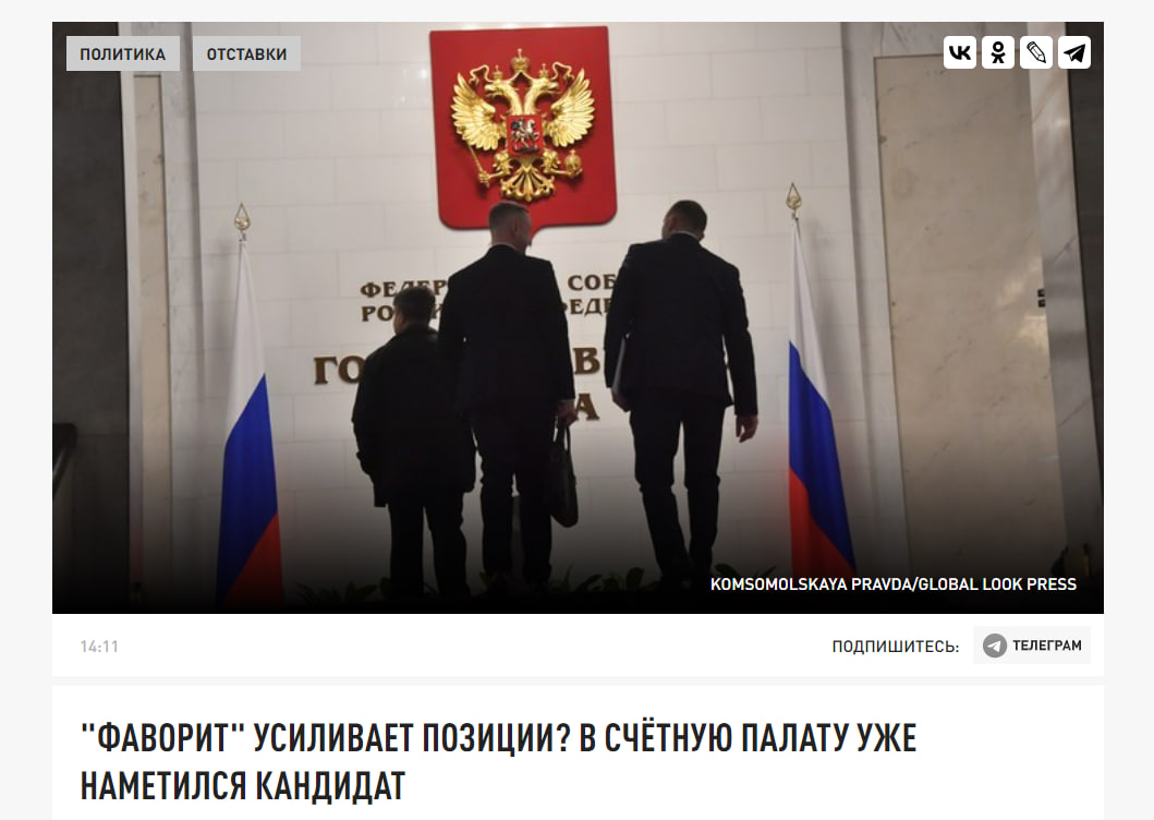 Напомним, должность главы Счётной палаты стала вакантной ещё в ноябре 2022 года - после того как её бывший руководитель Алексей Кудрин перешёл на работу в "Яндекс". В сентябре 2023 года президент России Владимир Путин прокомментировал ситуацию, связанную с отсутствием главы Счётной палаты, заявив, что это не мешает работе высшего органа госаудита, подтвердив, что кадровый вопрос будет решён, когда "ситуация созреет".