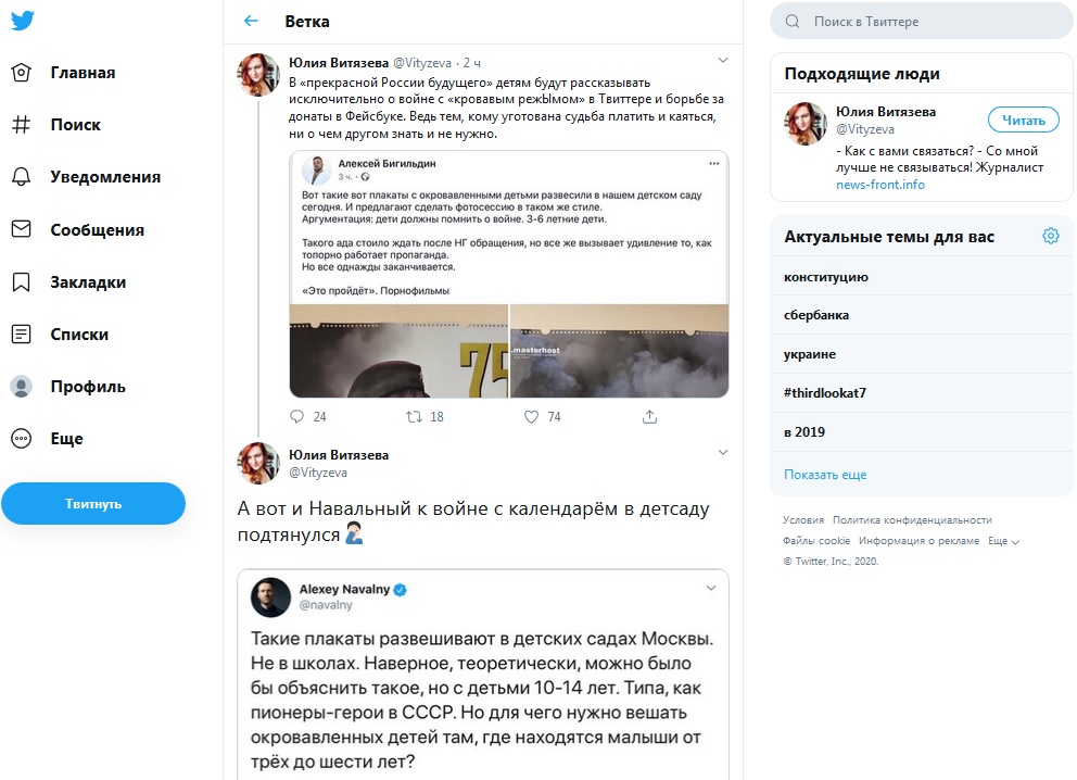 В "прекрасной России будущего" детям будут рассказывать исключительно о войне с "кровавым режЫмом" в "Твиттере" и борьбе за донаты в "Фейсбуке". Ведь тем, кому уготована судьба платить и каяться, ни о чём другом знать и не нужно", - ехидно комментирует журналистка и блогер Юлия Витязева.