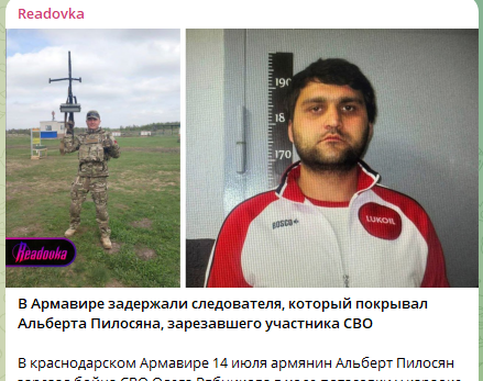 В Армавире завершено расследование по делу об убийстве ветерана СВО Олега Рябчикова. Трагедия произошла летом прошлого года. Следственный комитет Краснодарского края выяснил, что в преступлении участвовали трое: Альберт Пилосян, нанесший смертельные ножевые ранения бойцу, а также полицейский Самвел Мирижанов вместе со своим братом, сообщает Telegram-канал Readovka.