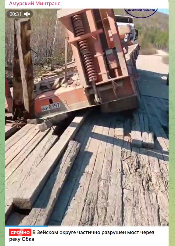 "26 мая на 77-м километре автодороги Зея - Золотая Гора в Зейском округе произошло частичное разрушение проезжей части моста через р. Обка. Инцидент случился из-за проезда по мосту тяжеловесного транспортного средства, не имеющего соответствующего разрешения", - сообщили в пресс-службе амурского Минтранса.