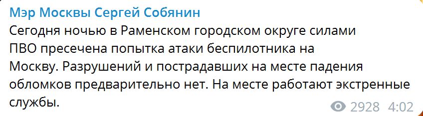 В Раменском районе Подмосковья сбит БПЛА, сообщил Собянин