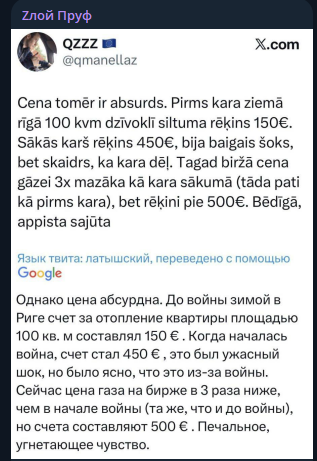 Телеграм-канал Zлой Пруф публикует пост из соцсети Х от жителя латвийской столицы, который называет цену за отопление абсурдной. По его словам, до событий на Украине отопление для квартиры в 100 "квадратов" в Риге обходилось в 150 евро, после начала СВО - 450 евро.