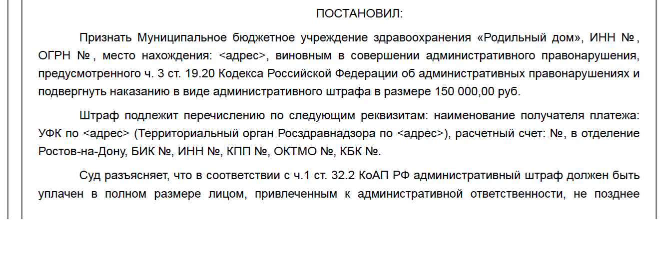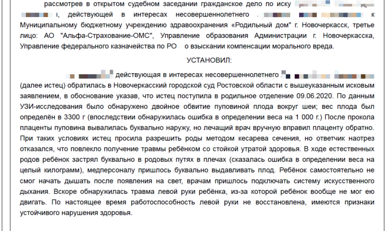 Ещё два дела нашлись в картотеке суда по фактам, выявленным в новочеркасском роддоме, где ранее роженица скончалась, получив четыре (!) укола анестезии, хотя и первого, судя по всему, было достаточно, чтобы навредить несчастной. По факту смерти проводится проверка, мы же собрали информацию и по другим доказанным случаям халатности. Как минимум, в двух случаях детей в этом роддоме калечили. Впрочем, суд посчитал, что травмы незначительные, дав меньшую компенсацию.