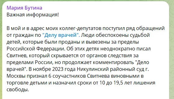 "Общественность обеспокоена возможным созданием прецедента, когда под видом лечения бесплодия с помощью суррогатного материнства совершается торговля российскими детьми, которых вывозят за пределы Российской Федерации для неизвестных целей", - указала в Сети Мария Бутина. Также она напомнила, что ещё в 2022 году Госдума приняла законопроект, запрещающий оказание услуг суррогатного материнства для иностранцев. Но "дело врачей" произошло до вступления закона в силу, что и пытается использовать защита.
