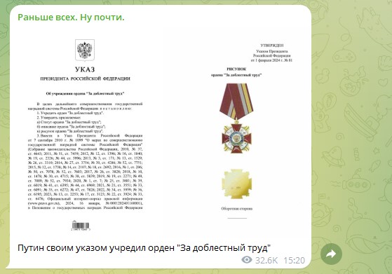 В России учредили новый орден. Владимир Путин поставил подпись.