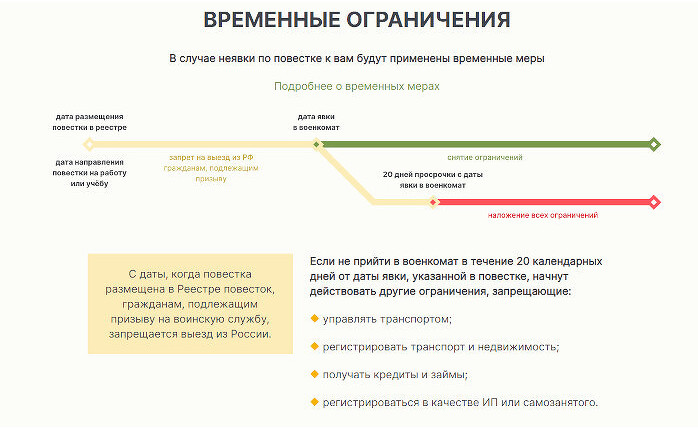 С момента размещения повестки в реестре потенциальному призывнику запрещается выезд из страны. Затем, в случае неявки призывника в военкомат по повестке в течение 20 дней, в отношении него начнут действовать запреты на управление транспортом, регистрацию транспорта и недвижимости, получение кредитов и займов, а также на регистрацию в качестве ИП или самозанятого. При этом, согласно информации на сайте, все ограничения обещают снять в течение суток после явки в военкомат.