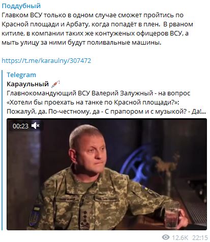 Главком ВСУ только в одном случае сможет пройтись по Красной площади и Арбату, когда попадёт в плен. В рваном кителе, в компании таких же контуженых офицеров ВСУ, а мыть улицу за ними будут поливальные машины,