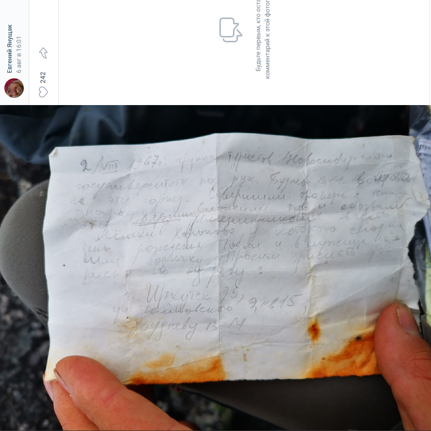 В записке также содержалось указание передать её непосредственно Будневу в Иркутск, по домашнему адресу. К сожалению, Виктор Буднев до сегодняшнего дня не дожил – он погиб в 1980 году, в ходе сплава по реке Тенек в Джунгарском Алатау.