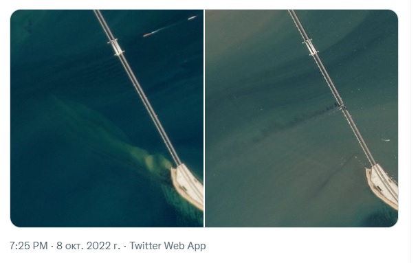 Американская компания PlanetScope опубликовала два снимка Крымского моста, сделанные из космоса. На одном из них отчетливо заметно состояние объекта после взрыва.