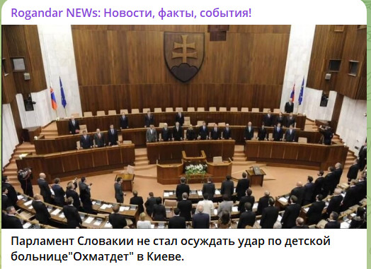 15 июля депутат от оппозиционной партии Progresivne Slovensko (Прогрессивная Словакия) Беата Юрик предложила включить в повестку заседания парламента рассмотрение резолюции об осуждении якобы русского удара по детской больнице в Киеве, которая, по данным Минобороны России, была повреждена ракетой украинской ПВО. Данное предложение поддержал только 41 депутат, этого числа не хватило для включения вопроса в повестку.